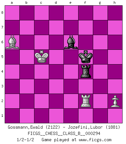 Last move : 1/2-1/2 2019 May 17 12:19:23 [Event "FICGS__CHESS__CLASS_B__000294"] [Site "FICGS"] [Date "2018.12.22"] [Round "1"] [White "Gossmann,Ewald"] [Black "Jozefini,Lubor"] [Result "1/2-1/2"] [WhiteElo "2122"] [BlackElo "1881"] 1.e4 g6 2.d4 Bg7 3.Nc3 d5 4.exd5 Nf6 5.Bb5+ Nbd7 6.Nf3 O-O 7.O-O Nb6 8.Re1 Nbxd5 9.Nxd5 Qxd5 10.Bf1 c5 11.Rxe7 cxd4 12.Qxd4 Qxd4 13.Nxd4 Nd5 14.Re4 Bd7 15.c3 Rfe8 16.Rxe8+ Rxe8 17.Bd2 Bxd4 18.cxd4 Re4 19.Bc3 Re6 20.g3 Nxc3 21.bxc3 Rb6 22.Re1 Kf8 23.Bd3 Be6 24.Re2 Bg4 25.Rd2 Bf3 26.Kf1 g5 27.Ke1 g4 28.a4 Rb3 29.Rc2 h5 30.a5 Ra3 31.a6 b6 32.Kd2 Ke7 33.Rb2 Bc6 34.c4 Rxa6 35.c5 Ra1 36.cxb6 axb6 37.Rxb6 Bd5 38.Bb1 f6 39.Kc3 Be6 40.Rb7+ Kd6 41.Rb6+ Ke7 42.Rb7+ Kd6 43.Be4 Ra3+ 44.Kb4 Rb3+ 45.Ka4 Rc3 46.Rb6+ Ke7 47.d5 Rc4+ 48.Rb4 Bd7+ 49.Kb3 Rc1 50.f4 gxf3 51.Bxf3 Kd6 52.Bxh5 Kxd5 53.Bf3+ Ke5 54.Re4+ Kd6 55.Rd4+ Ke7 56.Rd2 f5 57.Be2 Be6+ 58.Kb2 Rc8 59.Bd3 f4 60.gxf4 Kf6 61.Ba6 Rb8+ 62.Kc3 Rb3+ 63.Kd4 Kf5 64.Rf2 Rb4+ 65.Kc5 Rxf4 1/2-1/2 Robatsch defense Kingside Castling by player Black (move 6) Kingside Castling by player White (move 7) 10 pieces endgame at move 52 : White KRBPPP , Black KRBP WHITE : King + 1 Rook 1 Bishop 3 Pawns BLACK : King + 1 Rook 1 Bishop 1 Pawn 9 pieces endgame at move 52 : White KRBPP , Black KRBP WHITE : King + 1 Rook 1 Bishop 2 Pawns BLACK : King + 1 Rook 1 Bishop 1 Pawn 8 pieces endgame at move 60 : White KRBPP , Black KRB WHITE : King + 1 Rook 1 Bishop 2 Pawns BLACK : King + 1 Rook 1 Bishop 7 pieces endgame at move 65 : White KRBP , Black KRB WHITE : King + 1 Rook 1 Bishop 1 Pawn BLACK : King + 1 Rook 1 Bishop This chess game ended in a draw. Follow this game move after move (download)When you are lonely, when you feel yourself an alien in the world, play Chess. This will raise your spirits and be your counselor in war. (Aristotle) Dein Körper muss in Topform sein. Dein Schach verfällt, wenn dein Körper verfällt. Der Körper kann nicht vom Geist getrennt werden. (Robert James Fischer) Tu no necesitas jugar muy bien, únicamente ayudar a tu oponenet a que juegue muy mal. (Genrikh Chepukaitis) Je ne suis pas le dernier à jouer lâchement des coups douteux pendant le zeïtnot de l'adversaire pour l'achever: en effet les coups qui font le plus peur sont ceux que l'on ne comprend pas. Je me fais souvent peur quand je joue. (Un professeur anonyme) The difference between stupidity and genius is that genius has its limits. (Murphy)