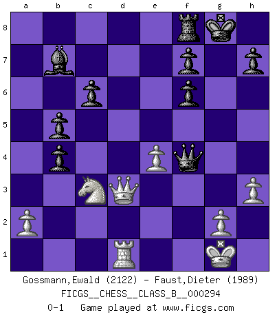 Last move : 0-1 2019 January 16 19:27:17 [Event "FICGS__CHESS__CLASS_B__000294"] [Site "FICGS"] [Date "2018.12.22"] [Round "1"] [White "Gossmann,Ewald"] [Black "Faust,Dieter"] [Result "0-1"] [WhiteElo "2122"] [BlackElo "1989"] 1.Nf3 Nf6 2.d4 d5 3.c4 e6 4.Nc3 c6 5.e3 Nbd7 6.Qc2 Bd6 7.Bd3 O-O 8.O-O dxc4 9.Bxc4 b5 10.Bd3 Bb7 11.e4 e5 12.h3 exd4 13.Nxd4 Nc5 14.Rd1 Qc7 15.Bg5 Be5 16.Nf3 Rad8 17.Bxf6 gxf6 18.Nxe5 Qxe5 19.b4 Rxd3 20.Rxd3 Nxd3 21.Qxd3 a5 22.f4 Qxf4 23.Rd1 axb4 0-1 Reti Opening Kingside Castling by player Black (move 7) Kingside Castling by player White (move 8) Player Black won this chess game. Follow this game move after move (download)What would Chess be without silly mistakes ? (Kurt Richter) Bobby Fischer ist kein Vorbild für die heutige Jugend. (Viktor Kortschnoi) Ciertamente el estado mental actual de Bobby Fischer es una tragedia. Uno de los mas grandes jugadores de Ajedrez del mundo -el orgullo y pena del Ajedrez Americano. (Frank Brady) La tactique est l'élément le plus important du milieu de jeu. (Siegbert Tarrasch) Ah, beer! The cause of, and the solution to, all of life's problems. (Homer Simpson)