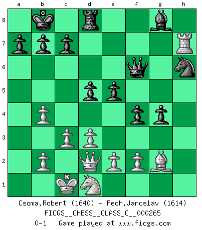 Last move : 0-1 2019 July 19 21:10:26 [Event "FICGS__CHESS__CLASS_C__000265"] [Site "FICGS"] [Date "2018.12.25"] [Round "1"] [White "Csoma,Robert"] [Black "Pech,Jaroslav"] [Result "0-1"] [WhiteElo "1640"] [BlackElo "1614"] 1.g4 d5 2.g5 e5 3.d3 h6 4.h4 Be7 5.Bg2 hxg5 6.hxg5 Rxh1 7.Bxh1 Bxg5 8.Nc3 Be6 9.Nf3 Bxc1 10.Qxc1 f6 11.Qd2 Qd6 12.a3 Ne7 13.O-O-O Nbc6 14.Rg1 g5 15.Bg2 O-O-O 16.Rh1 g4 17.Ne1 f5 18.Rh6 f4 19.Nd1 Kb8 20.c3 Nf5 21.Rh1 Bf7 22.Rh7 Nh6 23.Nc2 Qf6 24.Nb4 Nxb4 25.axb4 Bg8 0-1 Grob's attack Queenside Castling by player White (move 13) Queenside Castling by player Black (move 15) Player Black won this chess game. Follow this game move after move (download)The defensive power of a pinned piece is only imaginary. (Aaron Nimzovich) Ich verstehe den Grund nicht, warum die Aufteilung in Frauen und Männer überhaupt im Schach besteht. (Judith Polgar) Los tropiezos estan todos ahí en el tablero, esperando que se cometan. (Savielly Tartakover) Le génie consiste à savoir transgresser les règles au moment opportun. (Teichmann) When a man with money meets a man with experience, the man with experience leaves with money and the man with money leaves with experience. (Anonymous)