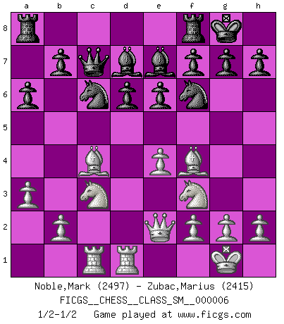 Last move : 1/2-1/2 2007 September 5 6:14:0 [Event "FICGS__CHESS__CLASS_SM__000006"] [Site "FICGS"] [Date "2007.05.28"] [Round "1"] [White "Noble,Mark"] [Black "Zubac,Marius"] [Result "1/2-1/2"] [WhiteElo "2497"] [BlackElo "2415"] 1.e4 c5 2.d4 cxd4 3.c3 dxc3 4.Nxc3 Nc6 5.Nf3 e6 6.Bc4 d6 7.O-O Be7 8.Qe2 a6 9.Rd1 Bd7 10.a3 Nf6 11.Bf4 Qc7 12.Rac1 O-O 1/2-1/2 Sicilian : Smith-Morra gambit Kingside Castling by player White (move 7) Kingside Castling by player Black (move 12) This chess game ended in a draw. Follow this game move after move (download)A chess genius has died; a loss for humanity. (Viktor Kortchnoi, about Bobby Fischer's death) Aljechin war kein Nazi. Er war ein Opportunist. Ein schrecklicher Mann. Er liebte Geld über alles und würde für Geld ein Jude, ein Katolik oder ein Protestant werden. (Miguel Najdorf) No nos podemos resistir a la fascinación de un sacrificio ya que la pasión por los sacrificios es parte de la naturaleza de un jugador de Ajedrez. (Rudolf Spielman) Karpov est une pièce de musée. (Garry Kasparov) The greatest con, that he ever pulled... was making you believe... that he is you. (Revolver, movie)