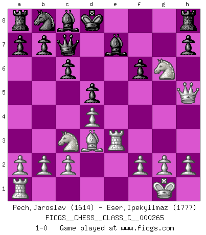 Last move : 1-0 2019 August 31 5:25:19 [Event "FICGS__CHESS__CLASS_C__000265"] [Site "FICGS"] [Date "2018.12.25"] [Round "1"] [White "Pech,Jaroslav"] [Black "Eser,Ipekyilmaz"] [Result "1-0"] [WhiteElo "1614"] [BlackElo "1777"] 1.e4 f6 2.d4 e6 3.Bd3 d6 4.Nc3 f5 5.exf5 exf5 6.Nh3 c6 7.O-O Qc7 8.Re1+ Kd8 9.Bg5+ Nf6 10.Bxf6+ gxf6 11.Qh5 Be7 12.Re3 f4 13.Nxf4 d5 14.Ng6 1-0 This chess game has been lost on time (started : 2018.12.25 16:12:55) Barnes defense Kingside Castling by player White (move 7) Player White won this chess game. Follow this game move after move (download)If your opponent offers you a draw, try to work out why he thinks he's worse off. (Nigel Short) Das Zentrum ist der Balkan des Schachbretts - Kriegshandlungen können in jedem Moment ausbrechen. (Aaron Nimzowitsch) El Ajedrez es un cuento de Hadas de las 1001 metidas de pata. (Savielly Tartakower) La menace est plus forte que l'exécution. (Aaron Nimzovitch) Man is still the most extraordinary computer of all. (John F. Kennedy)