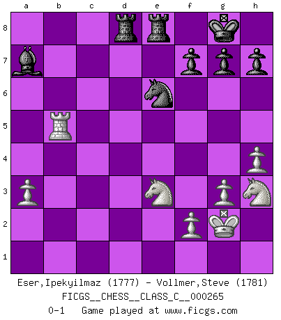Last move : 0-1 2019 April 3 14:57:52 [Event "FICGS__CHESS__CLASS_C__000265"] [Site "FICGS"] [Date "2018.12.25"] [Round "1"] [White "Eser,Ipekyilmaz"] [Black "Vollmer,Steve"] [Result "0-1"] [WhiteElo "1777"] [BlackElo "1781"] 1.a3 e5 2.d3 d5 3.d4 exd4 4.Qxd4 c5 5.Qd1 Nf6 6.Bg5 Be7 7.Bxf6 Bxf6 8.c3 O-O 9.g3 Nc6 10.Bg2 Be6 11.h3 Qd7 12.h4 Rfe8 13.Nh3 Rad8 14.Nd2 d4 15.cxd4 cxd4 16.Kf1 Bd5 17.Rc1 Bxg2+ 18.Kxg2 d3 19.exd3 Qxd3 20.Nc4 Qe4+ 21.Qf3 Qxf3+ 22.Kxf3 Nd4+ 23.Kg2 b5 24.Ne3 Ne2 25.Rc2 Nd4 26.Rc7 Ne6 27.Rxa7 Bxb2 28.Rb1 Bd4 29.Rxb5 Bxa7 0-1 Anderssen's Opening Kingside Castling by player Black (move 8) Player Black won this chess game. Follow this game move after move (download)Chess is war over the board. The object is to crush the opponents mind. (Bobby Fischer) Der vorletzte Fehler gewinnt. (Savielly Grigorievitsch Tartakower) En la perfecta combinación de Ajedrez como en una historia corta de primera clase, toda la trama y contra trama deberá conducir hacia un final sorprendente, el interes no es mitigado hasta el último momento. (Yates and Winter) On a dit que l'homme se distingue de l'animal par le fait qu'il achète plus de livres qu'il ne peut en lire. Je voudrais suggérer qu'inclure à la liste des livres quelques livres d'échecs rendrait la distinction manifeste. (Edward Lasker) May I never be complete. May I never be content. May I never be perfect. Deliver me, Tyler, from being perfect and complete. (Chuck Palahniuk, Fight Club)