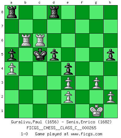 Last move : 1-0 2019 March 7 14:33:23 [Event "FICGS__CHESS__CLASS_C__000265"] [Site "FICGS"] [Date "2018.12.25"] [Round "1"] [White "Guralivu,Paul"] [Black "Senis,Enrico"] [Result "1-0"] [WhiteElo "1656"] [BlackElo "1682"] 1.d4 f5 2.g3 Nf6 3.Nc3 e6 4.Nf3 d6 5.Bg2 d5 6.O-O Nc6 7.a4 Ne4 8.Nxe4 fxe4 9.Ne5 Nxe5 10.dxe5 Bc5 11.Be3 Bxe3 12.fxe3 h5 13.Bh3 Qe7 14.c4 Bd7 15.cxd5 exd5 16.Bxd7+ Qxd7 17.Qd4 a6 18.Rf4 O-O-O 19.Qa7 c6 20.b4 Qc7 21.b5 Qxe5 22.Rb1 Qb8 23.Qxb8+ Kxb8 24.bxc6 Kc7 25.Rxb7+ Kxc6 26.Rxg7 Kc5 27.Rf6 Ra8 28.R7g6 a5 29.Rb6 Rhd8 30.Rgc6+ 1-0 Comment by player 2 : Enrico Senis : A classic clerical mistake! But the game was lost anyway. Dutch defense Kingside Castling by player White (move 6) Queenside Castling by player Black (move 18) Player White won this chess game. Follow this game move after move (download)Chess is a part of culture and if a culture is declining then Chess too will decline. (Mikhail Botvinnik) Ihnen, Herr Lasker, habe ich nur drei Worte zu sagen: Schach und matt. (Siegbert Tarrasch) Un mal día en el Ajedrez, es mejor que cualquier buen día en el trabajo. (Anonymous) Tous ces prétendus hommes politiques sont les pions, les Cavaliers, les Tours ou les Fous d'une partie d'échecs qui se jouera tant qu'un hasard ne renversera pas l'échiquier. (Honoré de Balzac) Big Chess is a place for big hallucinations. (Thibault de Vassal)