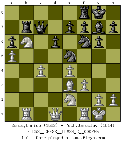 Last move : 1-0 2019 May 11 20:20:6 [Event "FICGS__CHESS__CLASS_C__000265"] [Site "FICGS"] [Date "2018.12.25"] [Round "1"] [White "Senis,Enrico"] [Black "Pech,Jaroslav"] [Result "1-0"] [WhiteElo "1682"] [BlackElo "1614"] 1.e4 c5 2.Nf3 d6 3.Bb5+ Bd7 4.Bxd7+ Qxd7 5.c4 Nc6 6.Nc3 Nf6 7.O-O g6 8.d4 cxd4 9.Nxd4 Bg7 10.Nde2 O-O 11.f3 a6 12.Be3 Ne5 13.b3 b5 14.Nd5 Qb7 15.Rc1 bxc4 16.bxc4 Rab8 17.Rb1 Qd7 18.Nb6 Qc7 19.a4 Rb7 20.a5 1-0 This chess game has been lost on time (started : 2018.12.25 16:12:55) Sicilian : Canal-Sokolsky attack, Sokolsky variation Kingside Castling by player White (move 7) Kingside Castling by player Black (move 10) Player White won this chess game. Follow this game move after move (download)A strong memory, concentration, imagination, and a strong will is required to become a great Chess player. (Bobby Fischer) Mein erstes Ziel war nicht, die Partie zu gewinnen, sondern eine Figur zu opfern. -- der junge (Wilhelm Steinitz) Fischer era un maestro de claridad y un Rey del posicionamiento astuto. Sus oponentes podían ver hacia donde se dirigía pero eran impotentes para detenerlo. (Bruce Pandolfini) Celui qui prend des risques peut perdre, celui qui n'en prend pas perd toujours. (Xavier Tartacover) All maxims have their antagonist maxims; proverbs should be sold in pairs, a single one being but a half truth. (William Mathews)