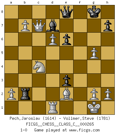 Last move : 1-0 2019 July 4 11:57:23 [Event "FICGS__CHESS__CLASS_C__000265"] [Site "FICGS"] [Date "2018.12.25"] [Round "1"] [White "Pech,Jaroslav"] [Black "Vollmer,Steve"] [Result "1-0"] [WhiteElo "1614"] [BlackElo "1781"] 1.c4 c5 2.Nc3 Nf6 3.Nf3 e6 4.e4 d6 5.d4 cxd4 6.Nxd4 Nc6 7.Be2 Be7 8.O-O Bd7 9.Be3 O-O 10.Rc1 Ne5 11.f4 Nc6 12.Nc2 Rc8 13.b4 Ne8 14.Qd2 f5 15.Rfd1 Nf6 16.c5 Nxe4 17.Nxe4 fxe4 18.cxd6 Bf6 19.b5 Na5 20.Na3 g5 21.fxg5 Be5 22.Rxc8 Qxc8 23.Qxa5 b6 24.Qxa7 Bf4 25.Bxf4 Rxf4 26.Qxb6 Qe8 27.Qc7 e3 28.b6 Rb4 29.b7 Rb2 30.Nc4 1-0 English : Symmetrical variation Kingside Castling by player White (move 8) Kingside Castling by player Black (move 9) Player White won this chess game. Follow this game move after move (download)I'm not a materialistic person, in that, I don't suffer the lack or loss of money. The absence of worldly goods I don't look back on. For Chess is a way I can be as materialistic as I want without having to sell my soul. (Jamie Walter Adams) Die meiste Zeit treffe ich auf Gegner, die meine Enkel sein könnten. Ich bin da, um ihnen zu zeigen, dass sie von mir noch einiges lernen können. (Viktor Kortschnoi) Combinaciones deslumbrantes son para la mayoría, mover madera es para los pocos. (Georg Kieninger) Les échecs c'est le défi de l'alpiniste, toujours plus haut, prêt à tout pour monter à l'assaut du Roi ennemi. Les échecs, c'est de la musique en mouvement, un ballet majestueux pour les yeux. C'est de la poésie composée par les fantômes du passé qui au même titre que Rimbaud ou Verlaine méritent notre admiration. Les échecs, c'est de la peinture ou le moindre mouvement modifie le tableau pour en faire un Picasso ou un Van Gogh. Les échecs, c'est tout et rien, c'est la vie et la mort. Jjulie33 sur le forum de France-Echecs. Hello Thibault, if I have had a plan (and I had one, I hope), I have forgotten it during the last week... - Hello Heinz-Georg. What do you mean a plan ? (Anonymous players, during a Big Chess game)