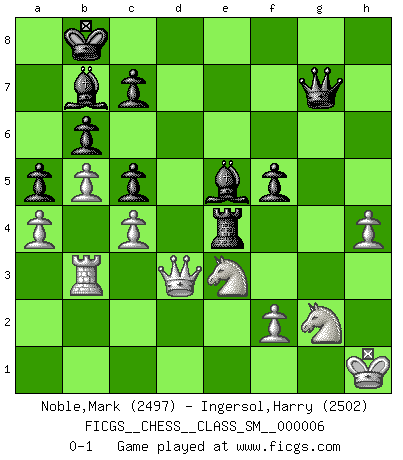 Last move : 0-1 2007 October 5 4:32:57 [Event "FICGS__CHESS__CLASS_SM__000006"] [Site "FICGS"] [Date "2007.05.28"] [Round "1"] [White "Noble,Mark"] [Black "Ingersol,Harry"] [Result "0-1"] [WhiteElo "2497"] [BlackElo "2502"] 1.e4 e5 2.Nf3 Nc6 3.Bb5 a6 4.Bxc6 dxc6 5.O-O Qd6 6.Na3 Be6 7.Qe2 f6 8.Rd1 Bg4 9.d4 exd4 10.c3 Ne7 11.Nc2 Ng6 12.Ncxd4 c5 13.Nc2 Qc6 14.h3 Bd7 15.b4 O-O-O 16.a4 Be7 17.b5 Qe6 18.Na3 a5 19.c4 Rhe8 20.Re1 Bd6 21.Rb1 b6 22.Rb3 Kb8 23.Nb1 Qf7 24.Qc2 h5 25.Be3 Nf4 26.Bxf4 Bxf4 27.Rd3 Be6 28.Na3 g5 29.g3 Be5 30.h4 gxh4 31.Nxh4 Qg8 32.Rb3 Rd7 33.Rd1 Qg4 34.Rxd7 Bxd7 35.Qd3 Bd4 36.Nc2 Rxe4 37.Ng2 f5 38.Kh2 h4 39.gxh4 Be5+ 40.Kg1 Qg7 41.Kh1 Bc8 42.Nce3 Bb7 0-1 Ruy Lopez : Exchange, Bronstein variation Kingside Castling by player White (move 5) Queenside Castling by player Black (move 15) Player Black won this chess game. Follow this game move after move (download)No one ever won a game by resigning. (Unknown) Ich habe kein Problem mit Frauen, sondern nur mit dem Niveau ihres Schachspiels (Judith Polgar) El juego de Fischer siempre fue nítido, racional y brillante. Uno de los mejores por siempre. (Dave Regis) Les Echecs représentent une sphère d'idées créatrices basée sur la volonté des deux protagonistes. (Smyslov) Big Chess is a place for big hallucinations. (Thibault de Vassal)
