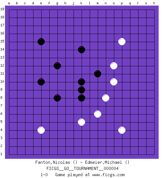 Last move : 1-0 2006 July 24 2:42:25 [Event "FICGS__GO__TOURNAMENT__000004 "] [Site "FICGS"] [Date "2006.06.08"] [Round "1"] [Black "Fanton,Nicolas "] [White "Edmeier,Michael "] [Result "1-0"] 1.k10 p4 2.k9 p15 3.k8 e4 4.e15 o10 5.e10 k5 6.k14 m6 7.g12 n8 8.m11 o12 9.g8 1-0 This go game has been lost on time (started : 2006.06.08 14:53:11) Here are the names of the openings (joseki) played in the four corners : Corner q16 : p15 m11Go-no-go (Wu~wu~) 5-5 Point. The 5-5 was experimented with briefly during the "New Fuseki" movement in Japan in the 1930s. The 5-5 point has not retained popularity because the 4-4 hoshi (star) point strikes a better balance between influence and territory. As one can see from the variations, though, the 5-5 is playable. Corner d4 : e4 g8Takamoku (Gomok, Gaomu`) 5-4 Point. The takamoku (high) point (5-4). With its emphasis on influence, the 5-4 point complements the 4-4 (hoshi) point in creating an influence-oriented fuseki. Player Black won this Go (weiqi, baduk) game.Follow this game move after move (download ) If you cannot succeed, then die gloriously. (Chinese proverb) Coffee just isn't my cup of tea. (Unknown)