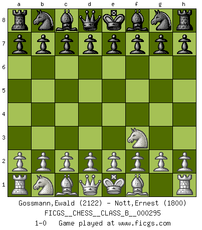 Last move : 1-0 2019 February 10 19:59:21 [Event "FICGS__CHESS__CLASS_B__000295"] [Site "FICGS"] [Date "2018.12.25"] [Round "1"] [White "Gossmann,Ewald"] [Black "Nott,Ernest"] [Result "1-0"] [WhiteElo "2122"] [BlackElo "1800"] 1.Nf3 1-0 This chess game has been lost on time (started : 2018.12.25 19:17:13) Reti Opening Player White won this chess game. Follow this game move after move (download)Could we look into the head of a Chess player, we should see there a whole world of feelings, images, ideas, emotion and passion. (Alfred Binet) Der Knackpunkt bei der Konzentration ist, daß wir nur durch sie etwas Neues und Ungewöhnliches am Schachbrett finden können. Sie ist der einzige Weg durch neue neue Ideen eine Überraschung zu bereiten. (Garry Kasparov) La estratégia requiere pensar, la táctica requiere observación. (Max Euwe) Si rien de grave n'est détecté lors de l'analyse d'une position, on joue alors le coup. Seconde règle de Blumenfeld. Remember : Your focus determines your reality. (Qui-Gon Jinn in Star Wars ep.1)