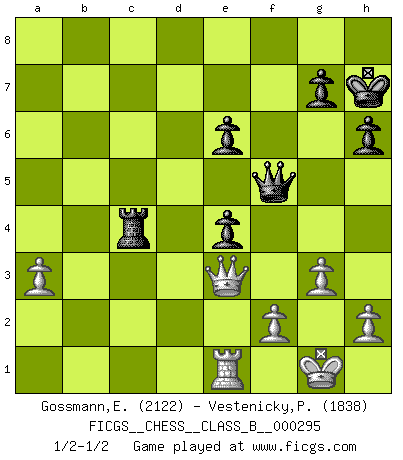 Last move : 1/2-1/2 2019 January 27 0:22:7 [Event "FICGS__CHESS__CLASS_B__000295"] [Site "FICGS"] [Date "2018.12.25"] [Round "1"] [White "Gossmann,Ewald"] [Black "Vestenicky,Patrik"] [Result "1/2-1/2"] [WhiteElo "2122"] [BlackElo "1838"] 1.e4 c5 2.c3 Nf6 3.e5 Nd5 4.Nf3 e6 5.d4 cxd4 6.cxd4 d6 7.Bc4 Nc6 8.O-O Be7 9.a3 a6 10.exd6 Qxd6 11.Nc3 O-O 12.Bd3 b5 13.Re1 Bb7 14.Ne4 Qc7 15.Bg5 Bxg5 16.Nexg5 h6 17.Ne4 Nf4 18.Bf1 Rad8 19.Rc1 Qb6 20.Nc5 Rd6 21.g3 Ng6 22.b4 Rfd8 23.Nb3 Na7 24.Bd3 Bxf3 25.Qxf3 Ne7 26.Qe4 Ng6 27.Qe3 Ne7 28.Qe4 f5 29.Qe2 Nac6 30.Qa2 Nd5 31.Rc5 Nf6 32.Rec1 Kh8 33.Be2 Ne4 34.Bf3 a5 35.bxa5 Nxa5 36.Bxe4 fxe4 37.Qb1 Nxb3 38.Qxb3 Rxd4 39.Rxb5 Qa6 40.Rb8 Rxb8 41.Qxb8+ Kh7 42.Qb2 Qd3 43.Re1 Rc4 44.Qe5 Qd5 45.Qf4 Qf5 46.Qe3 1/2-1/2 Sicilian : Alapin's variation (2.c3) Kingside Castling by player White (move 8) Kingside Castling by player Black (move 11) This chess game ended in a draw. Follow this game move after move (download)Chess is in its essence a game, in its form an art, and in its execution a science. (Baron Tassilo) Schon mancher Spieler hat aufgegeben, um zu vermeiden, daß er eine Figur verliert. (Savielly Grigorievitsch Tartakower) Sin errores no puede haber brillantez. (Emanuel Lasker) 'L'échange des dames est un coup dur pour les deux adversaires...' Un journaliste lors d'une partie du match Spassky-Fischer It's only after you lost everything, Tyler says, that you're free to do anything. (Chuck Palahniuk, Fight Club)