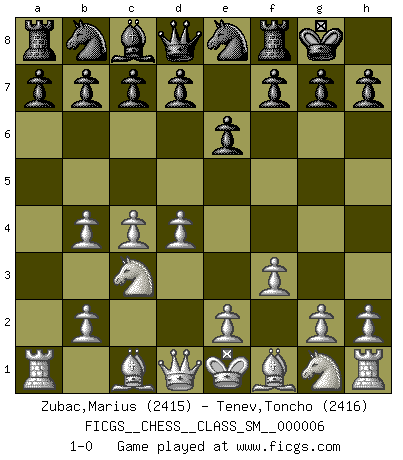 Last move : 1-0 2007 June 21 18:18:59 [Event "FICGS__CHESS__CLASS_SM__000006"] [Site "FICGS"] [Date "2007.05.28"] [Round "1"] [White "Zubac,Marius"] [Black "Tenev,Toncho"] [Result "1-0"] [WhiteElo "2415"] [BlackElo "2416"] 1.d4 Nf6 2.c4 e6 3.Nc3 Bb4 4.f3 O-O 5.a3 Ne8 6.axb4 1-0 Nimzo-Indian : Kmoch variation Kingside Castling by player Black (move 4) Player White won this chess game. Follow this game move after move (download)When in doubt... play Chess ! (Tevis) Gewinnen beim Schach fördert das Selbstvertrauen. Beim Sex spüre ich sowas nicht... (Garry Kasparov) La caracteristica mas importante en la posición del Ajedrez es la actividad de las piezas. Esto es absolutamente fundamental en todas las fases del juego: Apertura, Juego Medio y especialmente Finales. La limitación primordial en la actividad de una pieza, es la estructuración de los Peones. (Michael Stean) Je fais ceci parce que dans cinquante coups j'obtiendrai cela; je m'appelle Mikhail Moisevitch Botvinnik. (Botvinnik) If you lose the game you should win the analysis! (Proverb)