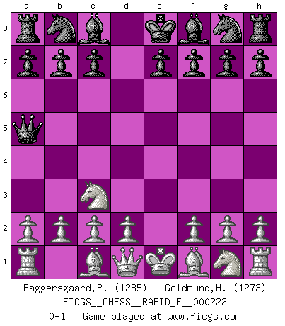 Last move : 0-1 2019 February 6 7:33:0 [Event "FICGS__CHESS__RAPID_E__000222"] [Site "FICGS"] [Date "2018.12.29"] [Round "1"] [White "Baggersgaard,Poulerik"] [Black "Goldmund,Heike"] [Result "0-1"] [WhiteElo "1285"] [BlackElo "1273"] 1.e4 d5 2.exd5 Qxd5 3.Nc3 Qa5 0-1 This chess game has been lost on time (started : 2018.12.29 8:21:37) Scandinavian (centre counter) defense Player Black won this chess game. Follow this game move after move (download)For surely of all the drugs in the world, Chess must be the most permanently pleasurable. (Assiac) Ein Schachspiel besteht aus drei Phasen: Die erste, wenn du hofftst den Vorteil zu haben, die zweite, wenn du glaubst einen Vorteil zu haben, und die dritte.... wenn du weißt Du wirst verlieren. (Savielly Grigorievitsch Tartakower) a manera como él juega al Ajedrez, demuestra la completa naturaleza de un hombre. (Stanley Ellin) Mais n'est-ce pas déjà le limiter injurieusement que d'appeler les échecs un jeu? N'est-ce pas aussi une science, un art, ou quelque chose qui, comme le cercueil de Mahomet entre ciel et terre, est suspendu entre l'un et l'autre, et qui réunit un nombre incroyable de contraires ? (Stefan Zweig) If you have any trouble condescending, find a Unix user to show you how it's done. (Scott Adams)