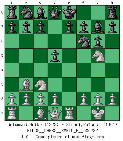 Last move : 1-0 2019 February 12 8:19:19 [Event "FICGS__CHESS__RAPID_E__000222"] [Site "FICGS"] [Date "2018.12.29"] [Round "1"] [White "Goldmund,Heike"] [Black "Simoni,Patucci"] [Result "1-0"] [WhiteElo "1273"] [BlackElo "1401"] 1.e4 d6 2.Nf3 Nf6 3.Bc4 Nxe4 4.O-O g6 5.Re1 Nf6 6.Ng5 d5 7.Bb3 Bg7 8.Nc3 1-0 This chess game has been lost on time (started : 2018.12.29 8:21:37) King's pawn Opening Kingside Castling by player White (move 4) Player White won this chess game. Follow this game move after move (download)The most powerful weapon in Chess is to have the next move. (David Bronstein) Warum muß ich gegen diesen IDIOTEN verlieren? (Aaron Nimzowitsch) Si el Ajedrez es una ciencia, es la mas inexacta. Si el Ajedrez es un arte, es demasiado inexacto para ser visto como tal. Si el Ajedrez es un deporte, es demasiado esotérico. Si el Ajedrez es un juego, es demasiado exigente para ser solo un juego. Si el Ajedrez es una aventura, es una muy demandante. Si el Ajedrez es una pasión, es una muy gratificante. Si el Ajedrez es la vida, es una muy triste. (Anónimo) Que feriez-vous si vous étiez en train de jouer aux échecs et que la fin du monde arrive ? Je continuerais à jouer. (Saint Borromée) Children in the dark cause accidents, accidents in the dark cause children. (Unknown)