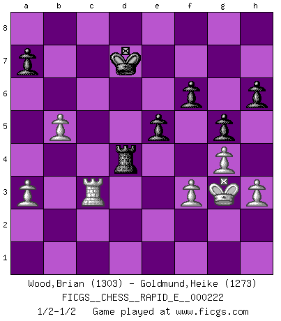 Last move : 1/2-1/2 2019 March 24 14:15:25 [Event "FICGS__CHESS__RAPID_E__000222"] [Site "FICGS"] [Date "2018.12.29"] [Round "1"] [White "Wood,Brian"] [Black "Goldmund,Heike"] [Result "1/2-1/2"] [WhiteElo "1303"] [BlackElo "1273"] 1.e4 d5 2.exd5 Qxd5 3.Nc3 Qa5 4.d4 Nf6 5.Nf3 Bf5 6.Bd3 Bxd3 7.Qxd3 e6 8.O-O c6 9.Re1 Bd6 10.Ne4 Nxe4 11.Qxe4 Nd7 12.c3 Nf6 13.Qc2 O-O 14.h3 Rad8 15.Bg5 Be7 16.b3 Rfe8 17.Ne5 Nd5 18.Bxe7 Rxe7 19.Rec1 f6 20.Nf3 Qc7 21.c4 Nb4 22.Qc3 c5 23.dxc5 Qxc5 24.a3 Nc6 25.b4 Qd6 26.b5 Nd4 27.Nxd4 Qxd4 28.Qxd4 Rxd4 29.c5 Red7 30.c6 bxc6 31.Rxc6 Kf7 32.Re1 e5 33.Rec1 Ra4 34.Rc7 Ke7 35.Rxd7+ Kxd7 36.Rc3 Rd4 37.g4 g6 38.Kg2 h6 39.Kg3 g5 40.f3 1/2-1/2 Scandinavian defense Kingside Castling by player White (move 8) Kingside Castling by player Black (move 13) This chess game ended in a draw. Follow this game move after move (download)Chess is a terrific way for kids to build self image and self esteem. (Saudin Robovic) Wir können eben der zündenden Macht des Opfers nicht wiederstehen, denn die Begeisterung für das Opfer liegt in der Natur des Menschen. (Rudolf Spielmann) A la fecha, Fischer esta simplemente un nivel arriba de todos los mejores jugadores de Ajedrez del mundo. (John Jacobs) Des points faibles ou des trous dans la position de l'adversaire doivent être occupés par des pièces et non pas par des pions. (Siegbert Tarrasch) Life is like a play: it's not the length but the excellence of the acting that matters. (Seneca)
