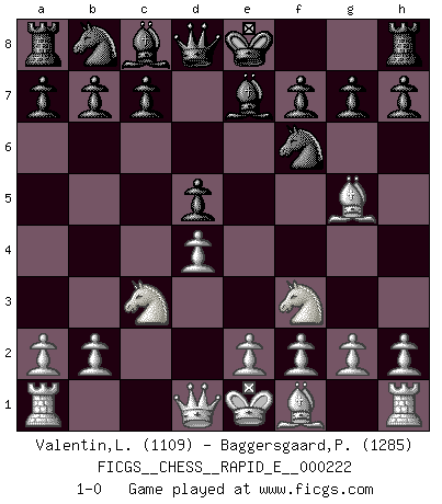 Last move : 1-0 2019 February 4 7:20:53 [Event "FICGS__CHESS__RAPID_E__000222"] [Site "FICGS"] [Date "2018.12.29"] [Round "1"] [White "Valentin,Laurentiu"] [Black "Baggersgaard,Poulerik"] [Result "1-0"] [WhiteElo "1109"] [BlackElo "1285"] 1.d4 d5 2.c4 e6 3.Nc3 Nf6 4.cxd5 exd5 5.Bg5 Be7 6.Nf3 1-0 This chess game has been lost on time (started : 2018.12.29 8:21:37) QGD : Exchange, positional line Player White won this chess game. Follow this game move after move (download)The combination player thinks forward; he starts from the given position, and tries the forceful moves in his mind. (Emanuel Lasker) Offener Brief an US-Präsident Bush anlässlich der Verhaftung Bobby Fishers: Verhaften Sie mich. Stecken Sie mich in dieselbe Zelle wie Bobby Fisher und geben Sie uns ein Schachspiel mit. (Boris Vassilievich Spassky) Mis oponentes también hacen buenas movidas. A veces yo no tomo esas cosas en consideración. (Bobby Fischer) La guerre est enfant de la passion, la passion est enfant du narcissisme et le narcissisme est l'enfant. (...) Une autre partie ? (Thibault de Vassal) There's no money in correspondence chess. (John Knudsen)
