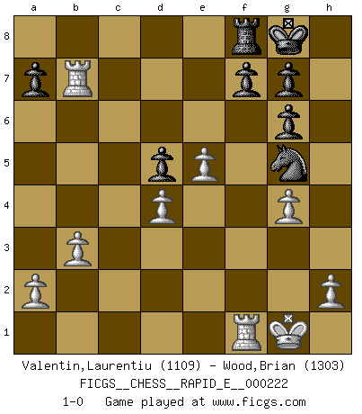 Last move : 1-0 2019 February 20 6:35:13 [Event "FICGS__CHESS__RAPID_E__000222"] [Site "FICGS"] [Date "2018.12.29"] [Round "1"] [White "Valentin,Laurentiu"] [Black "Wood,Brian"] [Result "1-0"] [WhiteElo "1109"] [BlackElo "1303"] 1.e4 c5 2.c3 e6 3.d4 d5 4.exd5 exd5 5.Nf3 Nc6 6.Bb5 Nf6 7.O-O Be7 8.Be3 cxd4 9.Nxd4 Bd7 10.Nd2 Nxd4 11.Bxd7+ Qxd7 12.Bxd4 O-O 13.Nf3 Rfe8 14.Ne5 Qc7 15.f4 Bc5 16.g4 Rxe5 17.fxe5 Bxd4+ 18.cxd4 Ne4 19.Rc1 Qb6 20.b3 Qh6 21.Qf3 Rf8 22.Rc7 Ng5 23.Qf5 Qg6 24.Qxg6 hxg6 25.Rxb7 1-0 Sicilian : Alapin's variation (2.c3) Kingside Castling by player White (move 7) Kingside Castling by player Black (move 12) Player White won this chess game. Follow this game move after move (download)What is the object of playing a gambit opening?... To acquire a reputation of being a dashing player at the cost of losing a game. (Siegbert Tarrasch) Glücklicherweise sind Großmeister Ruben Fines reine Schachbücher weniger phallozentrisch [als seine Schachpsychologie] und deswegen auch weniger lächerlich. (Nigel Short) Coloca el contenido de las piezas del Ajedrez en un sombrero, agitalo vigorosamente, arrojalas en un tablero desde una altura de 30 centimetros y así obtendras el estilo de Steinitz. (H. E. Bird) Seul un grand joueur sait à quel point il joue faiblement. (Xavier Tartacover) Any activity becomes creative when the doer cares about doing it right or doing it better. (John Updike)