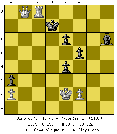 Last move : 1-0 2019 February 20 7:15:55 [Event "FICGS__CHESS__RAPID_E__000222"] [Site "FICGS"] [Date "2018.12.29"] [Round "1"] [White "Benone,Mateia"] [Black "Valentin,Laurentiu"] [Result "1-0"] [WhiteElo "1144"] [BlackElo "1109"] 1.e4 c5 2.c3 d6 3.d4 cxd4 4.cxd4 a6 5.Nc3 Nc6 6.d5 Nb8 7.Nf3 e5 8.dxe6 fxe6 9.Ng5 Nf6 10.e5 dxe5 11.Qxd8+ Kxd8 12.Nf7+ Ke8 13.Nxh8 Bb4 14.Bg5 Ke7 15.Rd1 Nc6 16.Bxf6+ gxf6 17.Bd3 Bd7 18.Nf7 Kxf7 19.Bxh7 Nd4 20.Be4 Bc6 21.Bxc6 bxc6 22.h4 Rg8 23.Kf1 f5 24.Ne2 Nxe2 25.Kxe2 Rxg2 26.Rdg1 Rxg1 27.Rxg1 Bf8 28.Rd1 a5 29.Rd7+ Kf6 30.Ra7 Bb4 31.Rc7 a4 32.Rxc6 a3 33.Rc4 Be7 34.b4 Kf7 35.b5 e4 36.b6 Bd6 37.b7 Ke7 38.Rc8 Kd7 39.h5 Bf4 40.h6 Bxh6 41.b8Q 1-0 Sicilian : Alapin's variation (2.c3) Promotion Queen by player White (move 41) Player White won this chess game. Follow this game move after move (download)Personally, I rather look forward to a computer program winning the world Chess Championship. Humanity needs a lesson in humility. (Richard Dawkings) Im Internet Chess Club betrug mein Rating vorübergehend 3350 ELO-Punkte. (Sergej Karjakin) El Peón aislado arroja penumbra sobre todo el tablero. (Aaron Nimzovich) Les Echecs ont trois composantes : le temps, l'espace et le matériel en dernier. (Mikhail Tal) Is not life a hundred times too short to bore ourselves ? (Friedrich Nietzsche)