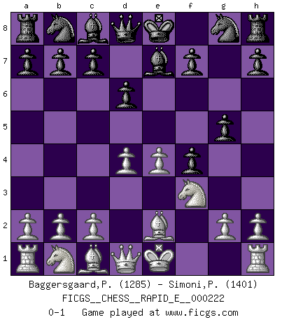 Last move : 0-1 2019 February 4 19:24:17 [Event "FICGS__CHESS__RAPID_E__000222"] [Site "FICGS"] [Date "2018.12.29"] [Round "1"] [White "Baggersgaard,Poulerik"] [Black "Simoni,Patucci"] [Result "0-1"] [WhiteElo "1285"] [BlackElo "1401"] 1.e4 e5 2.f4 exf4 3.Nf3 Be7 4.Be2 d6 5.d4 g5 0-1 This chess game has been lost on time (started : 2018.12.29 8:21:37) KGA : Cunningham defense Player Black won this chess game. Follow this game move after move (download)Different people feel differently about resigning. (Bobby Fischer) Ohne ihre Erfolge schmälern zu wollen würde ich sagen Petrosian, Spassky und Karpov verdanken ihre Siege ihren Trainern - Boleslavsky, Bondarevsky und Furman. (Mikhail Moiseyevich Botvinik) Peones: ellos son el alma de esta partida, solos forman el ataque y la defensa. (Philidor) L'ordinateur a tué l'originalité. Il n'y a plus guère d'aventures sur l'échiquier. (Jacob Murray) Perhaps chess is the wrong game for the times (The Chess Master and the Computer, by Garry Kasparov - 2010)