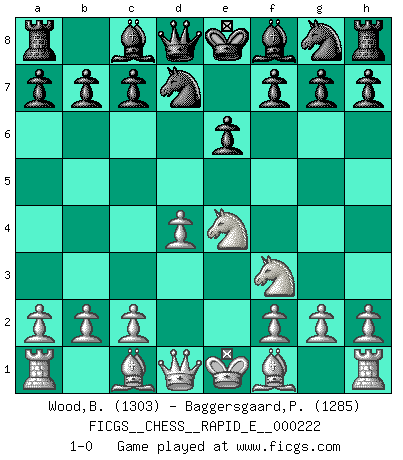 Last move : 1-0 2019 February 4 19:24:17 [Event "FICGS__CHESS__RAPID_E__000222"] [Site "FICGS"] [Date "2018.12.29"] [Round "1"] [White "Wood,Brian"] [Black "Baggersgaard,Poulerik"] [Result "1-0"] [WhiteElo "1303"] [BlackElo "1285"] 1.e4 e6 2.d4 d5 3.Nd2 dxe4 4.Nxe4 Nd7 5.Nf3 1-0 This chess game has been lost on time (started : 2018.12.29 8:21:37) French : Tarrasch Player White won this chess game. Follow this game move after move (download)You have to have the fighting spirit. You have to force moves and take chances. (Bobby Fischer) Ein Isolani verdüstert die Stimmung auf dem ganzen Schachbrett. (Savielly Grigorievitsch Tartakower) Cuando veas una buena jugada, trata de encontrar otra mejor. (Emanuel Lasker) Il vaut toujours mieux jouer un plan faux de façon logique que de n'avoir pas de plan du tout. (Victor Kortchnoï) Imagination is more important than knowledge. Knowledge is limited. Imagination encircles the world. (Albert Einstein)