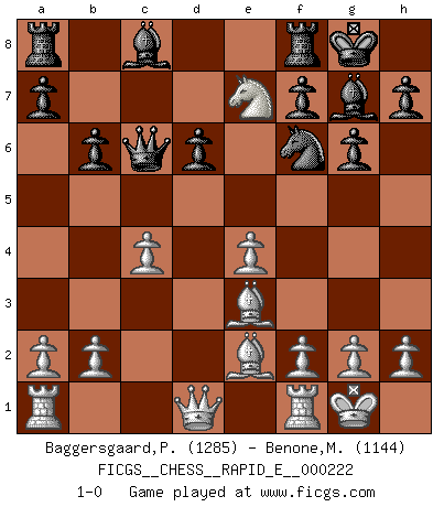Last move : 1-0 2018 December 29 23:36:58 [Event "FICGS__CHESS__RAPID_E__000222"] [Site "FICGS"] [Date "2018.12.29"] [Round "1"] [White "Baggersgaard,Poulerik"] [Black "Benone,Mateia"] [Result "1-0"] [WhiteElo "1285"] [BlackElo "1144"] 1.e4 c5 2.Nf3 Nc6 3.d4 cxd4 4.Nxd4 g6 5.c4 Bg7 6.Be3 Nf6 7.Nc3 O-O 8.Be2 d6 9.O-O b6 10.Nxc6 Qc7 11.Nd5 Qxc6 12.Nxe7+ 1-0 Sicilian : Accelerated Fianchetto, Maroczy bind, 6.Be3 Kingside Castling by player Black (move 7) Kingside Castling by player White (move 9) Player White won this chess game. Follow this game move after move (download)I believe that Chess possesses a magic that is also a help in advanced age. A rheumatic knee is forgotten during a game of Chess and other events can seem quite unimportant in comparison with a catastrophe on the chessboard. (Vlastimil Hort) Vielleicht wirkt die Aura früherer Spieler glanzvoller als die der heutigen Spieler, aber das liegt daran, dass man kein Programm wie Fritz hatte, das einem all die Löcher in ihren Partien zeigt. (Vladimir Kramnik) Debió haber existido una vez en que los hombres eran semidióses, de otra manera no hubiesen podido inventar el Ajedrez. (Gustav Schenk) Je fais ceci parce que dans cinquante coups j'obtiendrai cela; je m'appelle Mikhail Moisevitch Botvinnik. (Botvinnik) Knowledge will give you power, but character respect. (Bruce Lee)
