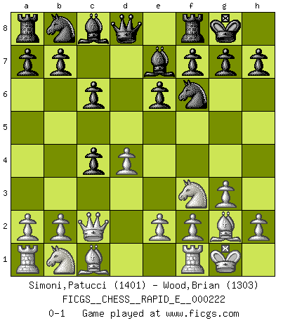 Last move : 0-1 2019 February 11 8:1:44 [Event "FICGS__CHESS__RAPID_E__000222"] [Site "FICGS"] [Date "2018.12.29"] [Round "1"] [White "Simoni,Patucci"] [Black "Wood,Brian"] [Result "0-1"] [WhiteElo "1401"] [BlackElo "1303"] 1.Nf3 Nf6 2.c4 e6 3.g3 d5 4.Bg2 c6 5.d4 Be7 6.O-O O-O 7.Qc2 dxc4 0-1 This chess game has been lost on time (started : 2018.12.29 8:21:37) Reti Opening Kingside Castling by player White (move 6) Kingside Castling by player Black (move 6) Player Black won this chess game. Follow this game move after move (download)Spassky will not be psyched out by Fischer. (Mike Goodall) Wenn ich Weiß habe gewinne ich weil ich Weiß habe, wenn ich Schwarz habe gewinne ich weil ich Bogoljubov bin. (Efim Bogoljubov) Creo que una cierta cantidad de temperamento es esperada de los genios del Ajedrez. (Ron Gross) Les échecs, c'est l'imagination. (David Bronstein) The problem with troubleshooting is that trouble shoots back. (Anonymous)