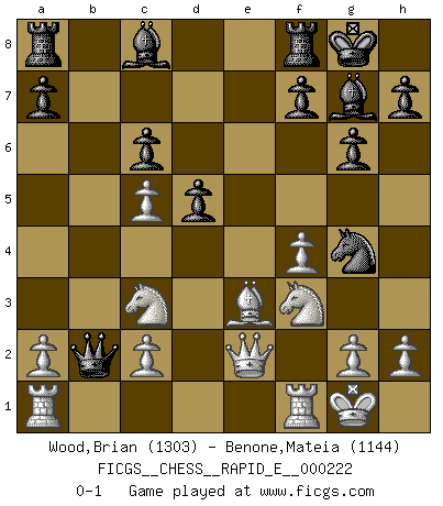 Last move : 0-1 2019 January 17 20:25:45 [Event "FICGS__CHESS__RAPID_E__000222"] [Site "FICGS"] [Date "2018.12.29"] [Round "1"] [White "Wood,Brian"] [Black "Benone,Mateia"] [Result "0-1"] [WhiteElo "1303"] [BlackElo "1144"] 1.e4 c5 2.Nc3 Nc6 3.f4 g6 4.Nf3 Bg7 5.d3 e6 6.Be3 d5 7.exd5 exd5 8.d4 Nh6 9.Bb5 Ng4 10.Bxc6+ bxc6 11.Qe2 O-O 12.O-O Qb6 13.dxc5 Qxb2 0-1 Sicilian : Grand Prix attack Kingside Castling by player Black (move 11) Kingside Castling by player White (move 12) Player Black won this chess game. Follow this game move after move (download)Life is a kind of Chess, with struggle, competition, good and ill events. (Benjamin Franklin) Im Hotelzimmer gab es nur zwei Schaben. (Über die Turnierbedingungen) (Peter Swidler) Vive, pierde y aprende al observar a tu oponente como gana. (Amber Steenbock) Ce n'est pas pour s'amuser qu'il joue aux échecs : il célèbre un culte. (Vladimir Nabokov) The smarter you play, the luckier you'll be. (Mark Pilarski)