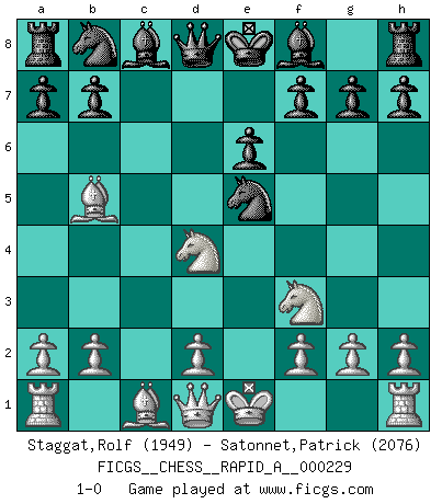 Last move : 1-0 2019 February 25 21:25:50 [Event "FICGS__CHESS__RAPID_A__000229"] [Site "FICGS"] [Date "2018.12.29"] [Round "1"] [White "Staggat,Rolf"] [Black "Satonnet,Patrick"] [Result "1-0"] [WhiteElo "1949"] [BlackElo "2076"] 1.e4 e6 2.Nf3 d5 3.Nc3 Nf6 4.e5 Nfd7 5.Ne2 c5 6.c3 d4 7.cxd4 cxd4 8.Nexd4 Nxe5 9.Bb5+ 1-0 This chess game has been lost on time (started : 2018.12.29 13:45:40) French defense Player White won this chess game. Follow this game move after move (download)What would Chess be without silly mistakes ? (Kurt Richter) Es hat in meinem Leben Zeiten gegeben, da ich sehr nahe daran war zu glauben, daß ich auch nicht eine einzige Schachpartie verlieren könnte. (José Raúl Capablanca) Mis oponentes también hacen buenas movidas. A veces yo no tomo esas cosas en consideración. (Bobby Fischer) Le jeu d'échecs est comme rejeté hors du temps. (Antoine de Saint-Exupéry) O divine art of subtlety and secrecy! Through you we learn to be invisible, through you inaudible and hence we can hold the enemy's fate in our hands. (Sun Tzu)
