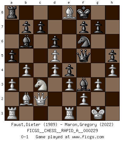 Last move : 0-1 2019 January 22 16:8:13 [Event "FICGS__CHESS__RAPID_A__000229"] [Site "FICGS"] [Date "2018.12.29"] [Round "1"] [White "Faust,Dieter"] [Black "Maron,Gregory"] [Result "0-1"] [WhiteElo "1989"] [BlackElo "2022"] 1.c4 e5 2.Nc3 Nf6 3.g3 Bb4 4.Nd5 Nxd5 5.cxd5 O-O 6.Bg2 d6 7.e3 Bf5 8.a3 Ba5 9.Ne2 Nd7 10.b4 Bb6 11.Bb2 a5 12.d4 e4 13.O-O Nf6 14.Nc3 Qd7 15.Qc2 Rfe8 16.Rfe1 h5 17.h4 Kf8 18.Bf1 Bg4 19.Bb5 Qf5 20.Bxe8 Bf3 0-1 English : Bremen, Smyslov system Kingside Castling by player Black (move 5) Kingside Castling by player White (move 13) Player Black won this chess game. Follow this game move after move (download)I give 98 percent of my mental energy to Chess. Others give only 2 percent. (Bobby Fischer) Wenn sie aufgeben, dann danke ich Ihnen für das Spiel (Eventualzug beim Fernschach). (Anonymous) El Ajedrez no es como la vida... ¡tiene reglas!. (Mark Pasternak) Mais n'est-ce pas déjà le limiter injurieusement que d'appeler les échecs un jeu? N'est-ce pas aussi une science, un art, ou quelque chose qui, comme le cercueil de Mahomet entre ciel et terre, est suspendu entre l'un et l'autre, et qui réunit un nombre incroyable de contraires ? (Stefan Zweig) Hardware: the parts of a computer that can be kicked. (Jeff Persis)