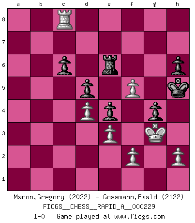 Last move : 1-0 2019 March 3 2:17:17 [Event "FICGS__CHESS__RAPID_A__000229"] [Site "FICGS"] [Date "2018.12.29"] [Round "1"] [White "Maron,Gregory"] [Black "Gossmann,Ewald"] [Result "1-0"] [WhiteElo "2022"] [BlackElo "2122"] 1.d4 Nf6 2.c4 e6 3.Nf3 b6 4.g3 Ba6 5.Qc2 Bb7 6.Bg2 Bb4+ 7.Bd2 Bxd2+ 8.Qxd2 O-O 9.O-O d5 10.cxd5 exd5 11.Nc3 Re8 12.Rfd1 c6 13.e3 Nbd7 14.Qc2 h6 15.Rac1 Qe7 16.a3 a5 17.Nh4 g6 18.Bh3 Rad8 19.Nf3 Kg7 20.Nd2 Ba6 21.Qa4 Qd6 22.Qc2 Qe7 23.Bg2 Rc8 24.Qb1 Ng4 25.Re1 f5 26.b4 Ngf6 27.Qb2 g5 28.bxa5 bxa5 29.Bh3 g4 30.Bf1 Bxf1 31.Rxf1 Rb8 32.Qa2 Rec8 33.Qc2 Ne4 34.Ndxe4 fxe4 35.Ne2 Qxa3 36.Nf4 Qd6 37.Qe2 Nf6 38.Rc5 a4 39.Ra1 Ra8 40.Qd1 a3 41.Qc1 Nd7 42.Rc3 Nf8 43.Rcxa3 Rxa3 44.Rxa3 Qd7 45.Ra6 Rc7 46.Qa3 Ne6 47.Ra8 Rb7 48.Kf1 Qe7 49.Qa6 Nxf4 50.gxf4 Qc7 51.Qa3 Qe7 52.Qxe7+ Rxe7 53.Rc8 Re6 54.Kg2 Kg6 55.Kg3 Kh5 56.f5 1-0 Queen's Indian : Nimzovich variation (exaggerated Fianchetto) Kingside Castling by player Black (move 8) Kingside Castling by player White (move 9) Player White won this chess game. Follow this game move after move (download)Only the player with the initiative has the right to attack. (Wilhelm Steinitz) Der Bart als Geschlechtszeichen mitten im Gesicht ist obszön. Daher gefällt er den Weibern. [Zugegeben, kein Schachzitat, aber unglaublich originell] (Arthur Schopenhauer) El juego de Damas es para vagabundos. (Paul Morphy) Même un GMI sait rarement calculer sur plus de cinq coups une attaque à sacrifices. (Rudolf Spielmann) Luck is what you have left over after you give 100 percent. (Langston Coleman)