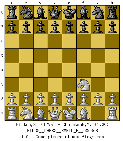 Last move : 1-0 2019 January 28 19:1:22 [Event "FICGS__CHESS__RAPID_B__000308"] [Site "FICGS"] [Date "2018.12.29"] [Round "1"] [White "Hilton,Stephen"] [Black "Chamakmak,Meslemlahouari"] [Result "1-0"] [WhiteElo "1795"] [BlackElo "1700"] 1.Nf3 1-0 This chess game has been lost on time (started : 2018.12.29 14:50:32) Reti Opening Player White won this chess game. Follow this game move after move (download)Let the perfectionist play postal. (Yasser Seirawan) Man wirke der falschen Auffassung entgegen, als ob jeder Zug Unmittelbares zu leisten habe; auch Werte- und Ruhezüge haben ihre Existenzberechtigung. (Aaron Nimzowitsch) No puedes jugar al Ajedrez si eres de corazón noble. (Proverbio Francés) Aidez vos pièces, elles vous aideront. (Paul Morphy) There are two kinds of tragedy in this world, one is not getting what you want and the other is getting. (Lord of war)