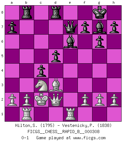 Last move : 0-1 2019 January 19 23:0:1 [Event "FICGS__CHESS__RAPID_B__000308"] [Site "FICGS"] [Date "2018.12.29"] [Round "1"] [White "Hilton,Stephen"] [Black "Vestenicky,Patrik"] [Result "0-1"] [WhiteElo "1795"] [BlackElo "1838"] 1.Nf3 g6 2.c4 Bg7 3.Nc3 e5 4.d4 exd4 5.Nxd4 Nc6 6.Nxc6 bxc6 7.Bd2 Rb8 8.Qc1 Nf6 9.e4 Nxe4 10.Bd3 Nxd2 11.Qxd2 Qe7+ 12.Kd1 O-O 13.Kc2 d5 14.cxd5 cxd5 15.Rab1 Be6 16.Rhe1 Rfd8 17.Re2 c5 18.R2e1 c4 0-1 Reti Opening Kingside Castling by player Black (move 12) Player Black won this chess game. Follow this game move after move (download)Do you realize Fischer almost never has any bad pieces? He exchanges them, and the bad pieces remain with his opponents. (Yuri Balashov) Man kann eine Schachpartie nur gewinnen, wenn das Gleichgewicht gestört ist. In einer Stellung mit ungestörtem Gleichgewicht ist auch das größte Genie hilflos - in der Stellung steckt dann eben kein genialer Einfall. (Wilhelm Steinitz) La batalla por la última verdad nunca sera ganada. Y es por eso que el Ajedrez es tan fascinante. (Hans Kmoch) Même un GMI sait rarement calculer sur plus de cinq coups une attaque à sacrifices. (Rudolf Spielmann) Luck has a peculiar habit of favoring those who don't depend on it. (Author unknown)