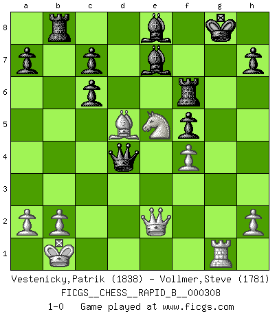 Last move : 1-0 2019 January 19 13:11:6 [Event "FICGS__CHESS__RAPID_B__000308"] [Site "FICGS"] [Date "2018.12.29"] [Round "1"] [White "Vestenicky,Patrik"] [Black "Vollmer,Steve"] [Result "1-0"] [WhiteElo "1838"] [BlackElo "1781"] 1.e4 e6 2.g3 d5 3.Bg2 dxe4 4.Nc3 f5 5.f3 exf3 6.Nxf3 Nf6 7.d4 Be7 8.Qe2 O-O 9.Bf4 Nc6 10.O-O-O Nd5 11.Nxd5 exd5 12.Kb1 Bd7 13.c4 g5 14.cxd5 gxf4 15.dxc6 bxc6 16.gxf4 Be8 17.Ne5 Rf6 18.Rhg1 Kh8 19.Rd3 Rb8 20.Rg3 Qxd4 21.Rg8+ Kxg8 22.Bd5+ 1-0 French defense Kingside Castling by player Black (move 8) Queenside Castling by player White (move 10) Player White won this chess game. Follow this game move after move (download)Chess is a sea in which a gnat may drink and an elephant may bathe. (Hindu proverb) Sicherlich können nur Meister einen Stil haben. Daß ein nicht-Meister auch nur ein einziges Mal in seinem Leben eine Partie folgerecht durchführte, habe ich niemals bemerkt. (Emanuel Lasker) Repentinamente, me resultaba obvio en mi analisis que yo había pasado por alto lo que Fischer había visto en el tablero con la mas grande facilidad. (Mikhail Botvinnik) Un footballeur joue avec ses pieds, parfois avec sa tête. Un joueur d'échecs ne joue qu'avec sa tête. Et quand il ne joue plus, il meurt. (Jacob Murray) A bird doesn't sing because it has an answer, it sings because it has a song. (Maya Angelou)