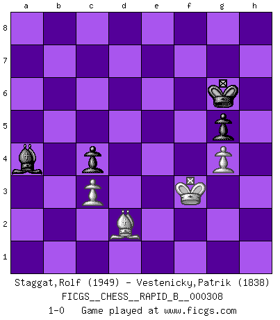 Last move : 1-0 2019 May 31 10:45:38 [Event "FICGS__CHESS__RAPID_B__000308"] [Site "FICGS"] [Date "2018.12.29"] [Round "1"] [White "Staggat,Rolf"] [Black "Vestenicky,Patrik"] [Result "1-0"] [WhiteElo "1949"] [BlackElo "1838"] 1.e4 c5 2.Nc3 Nc6 3.f4 g6 4.Nf3 Nh6 5.Bc4 Bg7 6.O-O O-O 7.d3 e6 8.a3 Nd4 9.Ba2 b6 10.Nxd4 Bxd4+ 11.Kh1 Qh4 12.h3 f5 13.Qe1 Qxe1 14.Rxe1 fxe4 15.dxe4 Bb7 16.f5 Nf7 17.fxe6 dxe6 18.Bxe6 Rae8 19.Bc4 Bxc3 20.bxc3 Kg7 21.Bf4 Rxe4 22.Rxe4 Bxe4 23.Re1 Re8 24.Kg1 Kf8 25.Rf1 Kg7 26.Re1 Kf8 27.Bb5 Re7 28.Re2 Bb7 29.Bb8 a6 30.Bd3 b5 31.c4 Bc6 32.cxb5 axb5 33.Kf2 c4 34.Rxe7 Kxe7 35.Be2 Be4 36.Bd1 g5 37.g3 Nh6 38.c3 Nf5 39.Ba7 Ke6 40.Bc5 Bc6 41.g4 Ne7 42.Bd4 Be4 43.Kg3 Nc6 44.Be3 h6 45.h4 Kf6 46.a4 bxa4 47.Bxa4 Kg6 48.hxg5 hxg5 49.Bxc6 Bxc6 50.Bd2 Ba4 51.Be3 Be8 52.Bd4 Bc6 53.Be3 Bb7 54.Bc1 Bc6 55.Bd2 Ba4 56.Kf3 1-0 This chess game has been lost on time (started : 2018.12.29 14:50:32) Sicilian : Grand Prix attack Kingside Castling by player White (move 6) Kingside Castling by player Black (move 6) 10 pieces endgame at move 48 : White KBBPP , Black KBNPP WHITE : King + 2 Bishops 2 Pawns BLACK : King + 1 Bishop 1 Knight 2 Pawns 9 pieces endgame at move 49 : White KBBPP , Black KBPP WHITE : King + 2 Bishops 2 Pawns BLACK : King + 1 Bishop 2 Pawns 8 pieces endgame at move 49 : White KBPP , Black KBPP WHITE : King + 1 Bishop 2 Pawns BLACK : King + 1 Bishop 2 Pawns Player White won this chess game. Follow this game move after move (download)Kasparov : J'adoube , Ivanchuk : S'il vous plaît ! (Garry Kasparov & Vassily Ivanchuk, Linares 1997) Ich verstehe mehr vom Schach als irgendein anderer lebender Meister. (José Raúl Capablanca) Robert Fischer es la ley hacia si mismo. (Larry Evans) Dans le domaine de la peinture, de la gravure et de la sculpture, dès la première décennie de notre siècle, les artistes abandonnent la représentation de la partie d'échecs pour se concentrer sur les pièces, sur les échiquiers et sur toutes les variations auxquelles les unes et les autres peuvent donner lieu. On passe en quelque sorte d'un thème social à un thème musical (au sens de la musica médiévale, c'est-à -dire d'une notion qui inclue le rythme, l'harmonie, la construction et la déconstruction, etc.). Graphiquement et picturalement, l'échiquier apparaît comme une structure ouverte, dynamique, d'une richesse infinie, autorisant toutes les combinatoires et débouchant sur des mouvements et des rythmes de nature exponentielle. (Michel Pastoureau) It's not the will to win, but the will to prepare to win that makes the difference. (Bear Bryant)