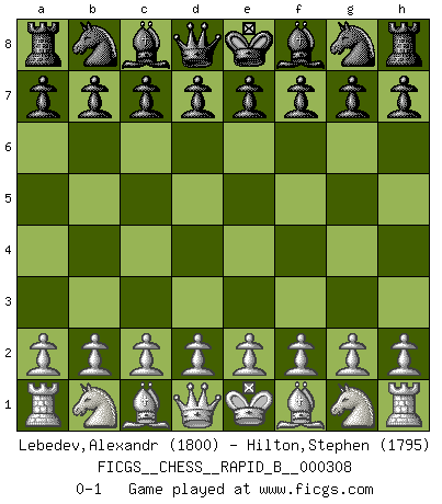 Last move : 0-1 2019 January 28 19:1:22 [Event "FICGS__CHESS__RAPID_B__000308"] [Site "FICGS"] [Date "2018.12.29"] [Round "1"] [White "Lebedev,Alexandr"] [Black "Hilton,Stephen"] [Result "0-1"] [WhiteElo "1800"] [BlackElo "1795"] 0-1 This chess game has been lost on time (started : 2018.12.29 14:50:32) Player Black won this chess game. Follow this game move after move (download)Chess books should be used as we use glasses: to assist the sight, although some players make use of them as if they thought they conferred sight. (Jose Raul Capablanca) Wenn Du einsam bist, wenn Du Dich in der Welt wie ein Fremder fühlst, spiele Schach. Das wird Deinen Geist erheben und Dein Ratgeber im Kampf sein. (Aristoteles) La enorme capacidad mental, en la que sin ella no puede un jugador de Ajedrez existir, es demasiado requerida por el Ajedrez al grado de que nunca podrá liberar su mente de este juego. (Albert Einstein) La vérité est comme le meilleur coup aux échecs : elle existe, mais il faut la chercher. (Arturo Perez-Reverte) If you lose the game you should win the analysis! (Proverb)