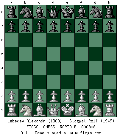 Last move : 0-1 2019 January 28 19:1:22 [Event "FICGS__CHESS__RAPID_B__000308"] [Site "FICGS"] [Date "2018.12.29"] [Round "1"] [White "Lebedev,Alexandr"] [Black "Staggat,Rolf"] [Result "0-1"] [WhiteElo "1800"] [BlackElo "1949"] 0-1 This chess game has been lost on time (started : 2018.12.29 14:50:32) Player Black won this chess game. Follow this game move after move (download)When your house is on fire, you can't be bothered with the neighbors. Or, as we say in Chess, if your King is under attack you don't worry about losing a Pawn on the Queen's side. (Gary Kasparov) Es ist wirklich schade, dass so viele Schachspieler nicht auf ihr Äußeres achten! (Alexandra Kosteniuk) El Ajedrez es un regaderazo frío para la mente. (Sir John Simon) En blitz, le Cavalier l'emporte sur le Fou. (Vlastimil Hort) A clear conscience is usually the sign of a bad memory. (Unknown)