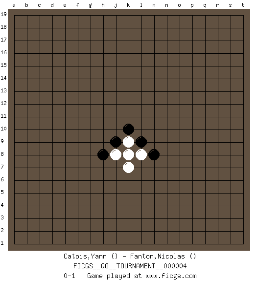Last move : 0-1 2006 July 24 2:42:25 [Event "FICGS__GO__TOURNAMENT__000004"] [Site "FICGS"] [Date "2006.06.08"] [Round "1"] [Black "Catois,Yann"] [White "Fanton,Nicolas"] [Result "0-1"] 1.k10 k9 2.j9 k8 3.l9 l8 4.m8 j8 5.h8 k7 0-1 This go game has been lost on time (started : 2006.06.08 14:53:11) Here are the names of the openings (joseki) played in the four corners : Corner q4 : l9 l8 This joseki is unknown. A weak or weird move has probably been played in this corner. Corner d4 : j9 j8 This joseki is unknown. A weak or weird move has probably been played in this corner. Player White won this Go (weiqi, baduk) game. Follow this game move after move (download)Connect with good shape. (Anonymous) Work expands to fill the time available. (C. Northcote Parkinson, in Parkinson's Laws)