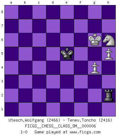 Last move : 1-0 2007 June 17 7:9:58 [Event "FICGS__CHESS__CLASS_SM__000006"] [Site "FICGS"] [Date "2007.05.28"] [Round "1"] [White "Utesch,Wolfgang"] [Black "Tenev,Toncho"] [Result "1-0"] [WhiteElo "2466"] [BlackElo "2416"] 1.d4 Nf6 2.c4 e6 3.Nf3 b6 4.g3 Ba6 5.Qc2 Bb7 6.Nc3 c5 7.dxc5 Bxc5 8.Bg2 O-O 9.O-O Qc8 10.b3 Nc6 11.Bb2 d5 12.cxd5 Nb4 13.Qd2 Nbxd5 14.Nxd5 Nxd5 15.e4 Bb4 16.Qg5 f6 17.Qh4 Nc3 18.Rfe1 Nxa2 19.Rxa2 Bxe1 20.Nxe1 Qd7 21.Bh3 Rfe8 22.Qg4 Qd2 23.Kf1 e5 24.Bxe5 Qd8 25.Bf4 Bc8 26.Qh5 g6 27.Qh6 Bxh3+ 28.Qxh3 Rxe4 29.Rd2 Qe8 30.Be3 Rd8 31.Nf3 a5 32.Rc2 Rxe3 33.fxe3 Qxe3 34.Qg4 Qxb3 35.Qe4 f5 36.Qe2 Qd3 37.Rb2 Rd6 38.Qxd3 Rxd3 39.Ne5 Ra3 40.Ke2 Rc3 41.Nf3 Rc6 42.Kd3 Kg7 43.Ne5 Rd6+ 44.Kc3 g5 45.Nc4 Rc6 46.Kd4 a4 47.Rb5 Rf6 48.Kc3 Kg6 49.Kb4 f4 50.Ne5+ Kh5 51.Kxa4 f3 52.Rb1 g4 53.Nd3 Kg5 54.Kb5 Re6 55.Rb2 Kf6 56.Kc4 h5 57.Kd4 b5 58.Nf4 Re5 59.Rc2 Rg5 60.Rc7 Rf5 61.Rc6+ Ke7 62.Ke4 Rf8 63.Rc1 Kd6 64.Rd1+ Kc6 65.Nxh5 b4 66.Nf4 b3 67.Nd3 Kb5 68.Kd4 Rc8 69.Rb1 Rc4+ 70.Ke3 Rc3 71.Ke4 Kc4 72.Ne5+ Kb4 73.Nxg4 Ka3 74.Ne3 Ka2 75.Rf1 b2 76.Kxf3 Ka3 77.Rb1 Rc1 78.Rxb2 Kxb2 79.h4 Kc3 80.h5 Rh1 81.g4 Kd4 82.Kf4 Rh2 83.Nf5+ Kd5 84.Kg5 Ke6 85.Kg6 Ke5 86.Nh6 1-0 Queen's Indian : Nimzovich variation (exaggerated Fianchetto) Kingside Castling by player Black (move 8) Kingside Castling by player White (move 9) 10 pieces endgame at move 65 : White KRNPP , Black KRPPP WHITE : King + 1 Rook 1 Knight 2 Pawns BLACK : King + 1 Rook 3 Pawns 9 pieces endgame at move 73 : White KRNPP , Black KRPP WHITE : King + 1 Rook 1 Knight 2 Pawns BLACK : King + 1 Rook 2 Pawns 8 pieces endgame at move 76 : White KRNPP , Black KRP WHITE : King + 1 Rook 1 Knight 2 Pawns BLACK : King + 1 Rook 1 Pawn 7 pieces endgame at move 78 : White KRNPP , Black KR WHITE : King + 1 Rook 1 Knight 2 Pawns BLACK : King + 1 Rook 6 pieces endgame at move 78 : White KNPP , Black KR WHITE : King + 1 Knight 2 Pawns BLACK : King + 1 Rook Player White won this chess game. Follow this game move after move (download)If Chess is a science, it's a most inexact one. If Chess is an art, it is too exacting to be seen as one. If Chess is a sport, it's too esoteric. If Chess is a game, it's too demanding to be just a game. If Chess is a mistress, she's a demanding one. If Chess is a passion, it's a rewarding one. If Chess is life, it's a sad one. (Unknown) Mutter, ich bin eben Ex-Weltmeister geworden. --beim nach Hause Kommen nach dem Verlust des WM-Titels an Mihail Botvinnik -- (Mikhail Nekhemyevich Tal) No puedes jugar al Ajedrez si eres de corazón noble. (Proverbio Francés) Roi des jeux et jeu des rois, les échecs portent en eux un sentiment d'infini. Ils donnent à celui qui s'est efforcé d'en approfondir les arcanes l'impression de n'être pas à la mesure de l'homme; en fait, ils constituent un résumé de l'univers, un microcosme, et figurent cette grande échelle qui, dans les plans de la lumière descend jusqu'à la matière, qui des abîmes insondables remonte jusqu'en l'infini de Dieu. (Pyrame) Perfection is achieved, not when there is nothing more to add, but when there is nothing left to take away. (Antoine de Saint-Exupéry)