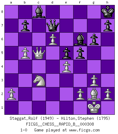 Last move : 1-0 2019 January 31 16:57:15 [Event "FICGS__CHESS__RAPID_B__000308"] [Site "FICGS"] [Date "2018.12.29"] [Round "1"] [White "Staggat,Rolf"] [Black "Hilton,Stephen"] [Result "1-0"] [WhiteElo "1949"] [BlackElo "1795"] 1.e4 c5 2.Nc3 Nc6 3.g3 g6 4.Bg2 Bg7 5.Nge2 Nf6 6.O-O O-O 7.Nd5 e6 8.Nxf6+ Qxf6 9.d3 Qe7 10.c3 d6 11.Be3 Bd7 12.d4 cxd4 13.cxd4 Rac8 14.Qd2 Rfe8 15.Rac1 e5 16.d5 Nb8 17.Rxc8 Rxc8 18.Bxa7 Na6 19.Rc1 Nc5 20.b4 Na6 21.Rxc8+ Bxc8 22.Be3 f5 23.b5 Nc5 24.Bxc5 dxc5 25.d6 Qd7 26.Qd5+ Kh8 27.Qxc5 Bf6 28.Nc3 1-0 Sicilian : Closed Kingside Castling by player White (move 6) Kingside Castling by player Black (move 6) Player White won this chess game. Follow this game move after move (download)I know people who have all the will in the world, but still can't play good Chess. (Bobby Fischer) Ich bin der einzige Schachspieler, der sich während der Vorbereitungen zum Turnier verletzt hat. (Woody Allen) La maestría del Ajedrez consiste esencialmente en analizar posiciónes de Ajedrez con precisión. (Mikhail Botvinnik) Comme les marins qui ont mille raisons différentes d'aller en mer, les joueurs d'échecs en ont tout autant avant de s'installer devant une table et jouer... (Vincent Bertignac, philosophe) A married woman is like a fish riding a bicycle. (Rodolfo d'Ettorre)