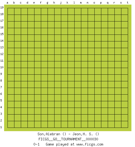 Last move : 0-1 2019 January 31 7:14:13 [Event "FICGS__GO__TOURNAMENT__000030"] [Site "FICGS"] [Date "2018.12.31"] [Round "1"] [Black "Son,Alebran"] [White "Jeon,H. S."] [Result "0-1"] 0-1 This go game has been lost on time (started : 2018.12.31 20:9:28) Here are the names of the openings (joseki) played in the four corners : Player White won this Go (weiqi, baduk) game. Follow this game move after move (download)Don't disturb symmetry. (Anonymous) The absolute truth is the thing that makes people laugh. (Carl Reiner)