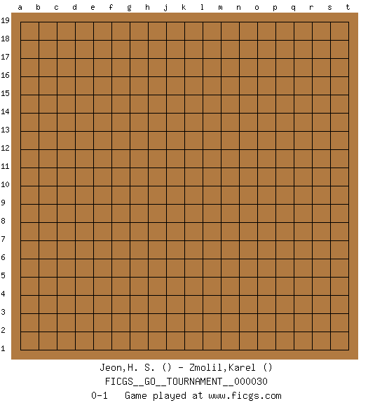 Last move : 0-1 2019 January 31 7:14:13 [Event "FICGS__GO__TOURNAMENT__000030"] [Site "FICGS"] [Date "2018.12.31"] [Round "1"] [Black "Jeon,H. S."] [White "Zmolil,Karel"] [Result "0-1"] 0-1 This go game has been lost on time (started : 2018.12.31 20:9:28) Here are the names of the openings (joseki) played in the four corners : Player White won this Go (weiqi, baduk) game. Follow this game move after move (download)Learning josekis by heart is useless if you don't try departing from them. (Pierre Audouard) I take risks, sometimes patients die, but not taking risks causes more patients to die. So I guess my biggest problem is I've been cursed with the ability to do the math. (Gregory House, House M.D.)