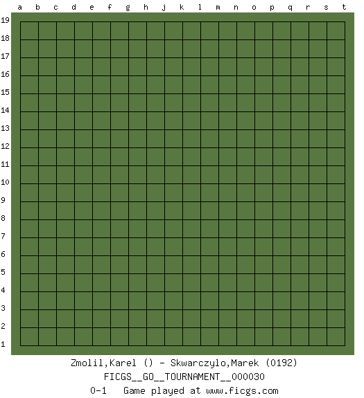 Last move : 0-1 2019 January 31 7:14:13 [Event "FICGS__GO__TOURNAMENT__000030"] [Site "FICGS"] [Date "2018.12.31"] [Round "1"] [Black "Zmolil,Karel"] [White "Skwarczylo,Marek"] [Result "0-1"] [Rating 2 "0192"] 0-1 This go game has been lost on time (started : 2018.12.31 20:9:28) Here are the names of the openings (joseki) played in the four corners : Player White won this Go (weiqi, baduk) game. Follow this game move after move (download)If your stone is capped, play the knight's move. (Anonymous) Waiting for chance ? Play in casinos. (FICGS proverb)