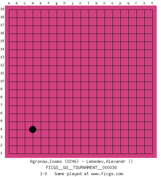 Last move : 1-0 2019 January 31 7:14:13 [Event "FICGS__GO__TOURNAMENT__000030"] [Site "FICGS"] [Date "2018.12.31"] [Round "1"] [Black "Agronow,Cosmo"] [White "Lebedev,Alexandr"] [Result "1-0"] [Rating 1 "0246"] 1.d4 1-0 This go game has been lost on time (started : 2018.12.31 20:9:28) Here are the names of the openings (joseki) played in the four corners : Corner d4 : d4 1-0 Hoshi (Hwajeom, Seongjeom, Xingwei`) 4-4 Point. The star or hoshi (4-4) point, emphasizing influence at the potential expense of territory. Player Black won this Go (weiqi, baduk) game. Follow this game move after move (download)The second line is the line of defeat, the third line is the line of territory, and the fourth line is the line of influence. (Anonymous) All battles are fought by scared men who'd rather be someplace else. (John Wayne in the movie In harm's way)