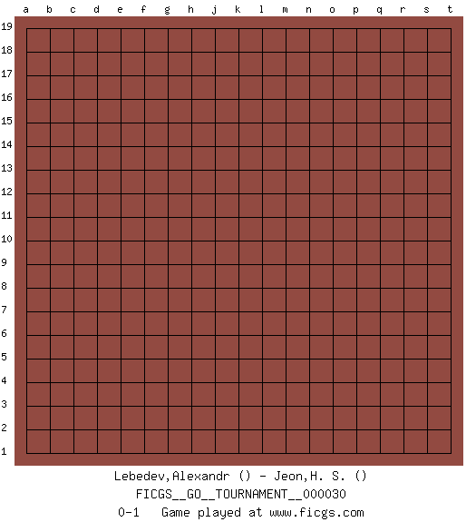 Last move : 0-1 2019 January 31 7:14:13 [Event "FICGS__GO__TOURNAMENT__000030"] [Site "FICGS"] [Date "2018.12.31"] [Round "1"] [Black "Lebedev,Alexandr"] [White "Jeon,H. S."] [Result "0-1"] 0-1 This go game has been lost on time (started : 2018.12.31 20:9:28) Here are the names of the openings (joseki) played in the four corners : Player White won this Go (weiqi, baduk) game. Follow this game move after move (download)The intersection is rarely neutral. (Pierre Audouard) Programmer - an organism that turns coffee into software. (Anonymous)