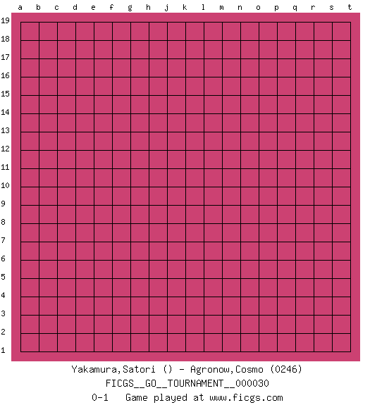 Last move : 0-1 2019 January 31 7:14:13 [Event "FICGS__GO__TOURNAMENT__000030"] [Site "FICGS"] [Date "2018.12.31"] [Round "1"] [Black "Yakamura,Satori"] [White "Agronow,Cosmo"] [Result "0-1"] [Rating 2 "0246"] 0-1 This go game has been lost on time (started : 2018.12.31 20:9:28) Here are the names of the openings (joseki) played in the four corners : Player White won this Go (weiqi, baduk) game. Follow this game move after move (download)Don't try to enclose an open skirt. (Anonymous) Computers make it easier to do a lot of things, but most of the things they make it easier to do don't need to be done. (Andy Rooney)