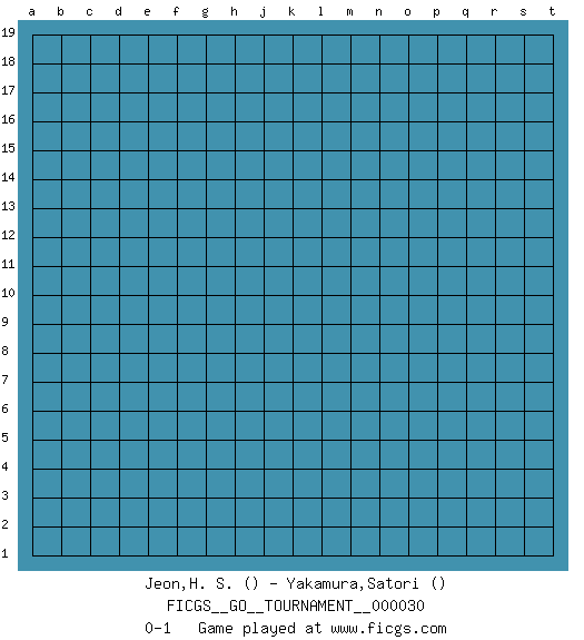 Last move : 0-1 2019 January 31 7:14:13 [Event "FICGS__GO__TOURNAMENT__000030"] [Site "FICGS"] [Date "2018.12.31"] [Round "1"] [Black "Jeon,H. S."] [White "Yakamura,Satori"] [Result "0-1"] 0-1 This go game has been lost on time (started : 2018.12.31 20:9:28) Here are the names of the openings (joseki) played in the four corners : Player White won this Go (weiqi, baduk) game. Follow this game move after move (download)Every move brings change. (Pierre Audouard) Think like a man of action, act like a man of thought. (Henri Louis Bergson)
