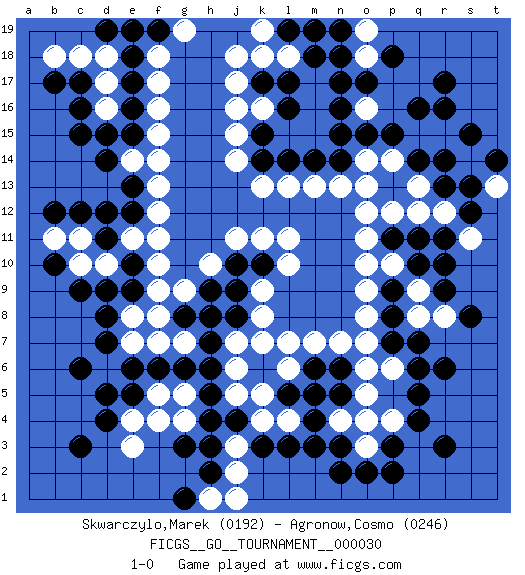 Last move : 1-0 2019 April 12 21:1:2 [Event "FICGS__GO__TOURNAMENT__000030"] [Site "FICGS"] [Date "2018.12.31"] [Round "1"] [Black "Skwarczylo,Marek"] [White "Agronow,Cosmo"] [Result "1-0"] [Rating 1 "0192"] [Rating 2 "0246"] 1.q4 d16 2.q16 e3 3.d14 f14 4.r6 p14 5.o17 m16 6.c12 f10 7.c9 o3 8.p3 p4 9.p2 o4 10.c3 r12 11.r14 q13 12.k17 k16 13.d4 e4 14.l3 d6 15.c6 l4 16.k3 k4 17.j4 j5 18.h3 g5 19.n2 j17 20.r9 q9 21.d7 e7 22.p7 o7 23.p8 o8 24.n5 n4 25.m4 m5 26.m3 o5 27.l5 k5 28.m6 o6 29.o2 l6 30.m5 m7 31.p9 o9 32.q10 p10 33.e15 f16 34.e16 f15 35.e17 e14 36.c17 f17 37.o15 o14 38.p11 o10 39.r11 o11 40.k6 l7 41.h5 j6 42.h6 j7 43.h7 h8 44.e12 f12 45.n15 m15 46.j8 k7 47.n14 n13 48.m14 m13 49.l14 l13 50.e6 f7 51.e9 f9 52.k14 k13 53.l17 j14 54.l16 l15 55.k15 j16 56.r17 o16 57.p15 q15 58.q14 r15 59.s15 j15 60.f6 g7 61.g6 f5 62.e5 q8 63.q6 p6 64.q7 p12 65.q11 q12 66.g8 f8 67.h9 h10 68.j10 j11 69.k10 l11 70.e13 f13 71.n17 s14 72.r16 s11 73.r10 l10 74.s13 k9 75.j9 k11 76.c15 g9 77.h8 k8 78.s12 t13 79.t14 e11 80.d11 f11 81.d8 d17 82.d15 d18 83.e18 e19 84.f19 f18 85.d19 g19 86.e19 c18 87.c16 d10 88.e10 c11 89.d12 g4 90.g3 f4 91.h4 m17 92.m18 k18 93.n16 b18 94.b17 c10 95.b10 e8 96.d9 l18 97.q5 m19 98.n19 j18 99.l19 k19 100.m19 o13 101.n6 n7 102.r13 b11 103.b12 o12 104.n3 o18 105.p18 o19 106.n18 j2 107.r3 j3 108.h2 h1 109.g1 j1 110.d5 r8 111.s8 1-0 Here are the names of the openings (joseki) played in the four corners : Corner d16 : d16 d14 Hoshi (Hwajeom, Seongjeom, Xingwei`) 4-4 Point. The star or hoshi (4-4) point, emphasizing influence at the potential expense of territory. Ikken Takagakari (Hankan Nop'dakeolch'im, Yi Gaojia, 1-Space High Approach). White typically responds at 6-4 or 3-10. White 4-10 is played when White finds play on the right side advantageous. White 4-8 or 3-8 may be played when White has support at top. Corner q16 : q16 p14 Hoshi (Hwajeom, Seongjeom, Xingwei`) 4-4 Point. The star or hoshi (4-4) point, emphasizing influence at the potential expense of territory. Corner d4 : e3 c9 Mokuhazushi (Waemok, Wai`mu`) 5-3 Point. The mokuhazushi (5-3) point was popular in the Edo period in Japan (1600 - 1867). It emphasizes influence; territorially, it is inferior to the 3-4 point. Player Black won this Go (weiqi, baduk) game. Follow this game move after move (download)The rectangular six is normally alive. (Anonymous) Fame, I have already. Now I need the money. (an elderly Steinitz)