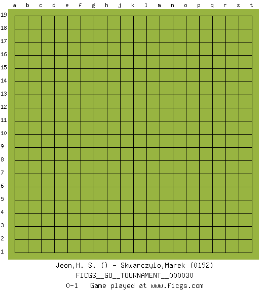 Last move : 0-1 2019 January 31 7:14:13 [Event "FICGS__GO__TOURNAMENT__000030"] [Site "FICGS"] [Date "2018.12.31"] [Round "1"] [Black "Jeon,H. S."] [White "Skwarczylo,Marek"] [Result "0-1"] [Rating 2 "0192"] 0-1 This go game has been lost on time (started : 2018.12.31 20:9:28) Here are the names of the openings (joseki) played in the four corners : Player White won this Go (weiqi, baduk) game. Follow this game move after move (download)To emphasize the lack of determination in his moves, one speaks of chance. (Pierre Audouard) Information on the Internet is subject to the same rules and regulations as conversation at a bar. (George Lundberg)