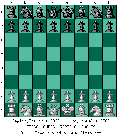 Last move : 0-1 2019 February 1 7:15:0 [Event "FICGS__CHESS__RAPID_C__000199"] [Site "FICGS"] [Date "2019.01.01"] [Round "1"] [White "Caglia,Gaston"] [Black "Muro,Manuel"] [Result "0-1"] [WhiteElo "1582"] [BlackElo "1688"] 0-1 This chess game has been lost on time (started : 2019.01.01 22:17:16) Player Black won this chess game. Follow this game move after move (download)The game of chess is the touchstone of the intellect. (Goethe) Obwohl ich alt bin, darf mir niemand den Finger in den Mund stecken, sonst beisse ich. (Wilhelm Steinitz) Bendita sea la memoria de aquel que dio al mundo este juego inmortal. (A. G. Gardiner) L'attaque fait le spectacle, la défense gagne les matchs. (Dicton footballistique) A generalist learns less and less about more and more until he knows nothing about everything. (Author unknown)