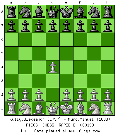 Last move : 1-0 2019 February 4 19:24:17 [Event "FICGS__CHESS__RAPID_C__000199"] [Site "FICGS"] [Date "2019.01.01"] [Round "1"] [White "Kuliy,Oleksandr"] [Black "Muro,Manuel"] [Result "1-0"] [WhiteElo "1757"] [BlackElo "1688"] 1.d4 1-0 This chess game has been lost on time (started : 2019.01.01 22:17:16) Queen's pawn Player White won this chess game. Follow this game move after move (download)Don't even mention losing to me. I can't stand to think of it. (Bobby Fischer) Ich verachte Kasparow. (Viktor Kortschnoi) Bobby es la celebridad menos entendida y malinterpretada que camina el la faz de esta tierra. (Yasser Seirawan) Le génie consiste à savoir transgresser les règles au moment opportun. (Teichmann) The arrogant army will lose certainly the battle. (Chinese proverb)