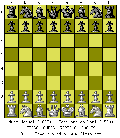 Last move : 0-1 2019 February 1 7:15:0 [Event "FICGS__CHESS__RAPID_C__000199"] [Site "FICGS"] [Date "2019.01.01"] [Round "1"] [White "Muro,Manuel"] [Black "Ferdiansyah,Yoni"] [Result "0-1"] [WhiteElo "1688"] [BlackElo "1500"] 0-1 This chess game has been lost on time (started : 2019.01.01 22:17:16) Player Black won this chess game. Follow this game move after move (download)In Chess, just as in life, today's bliss may be tomorrow's poison. (Assaic) Ich las kürzlich ein Buch von Nietzsche. Er sagte Religion verdumme nur die Menschen. Ich stimme zu. (Robert James Fischer) Algunos sacrificios son sólidos, los demás son míos. (Mikhail Tal) Toutes choses étant égales, c'est la conviction qui gagne. Alliée à une volonté de vaincre, elle sert de détonateur, suscite des idées, disperse les doutes et aide à penser clairement. (Robert Fischer) Real knowledge is to know the extent of one's ignorance. (Confucius)