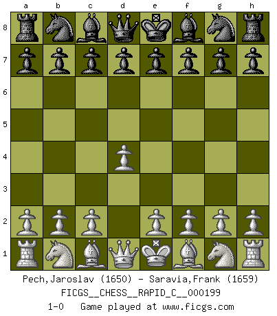 Last move : 1-0 2019 February 5 19:31:36 [Event "FICGS__CHESS__RAPID_C__000199"] [Site "FICGS"] [Date "2019.01.01"] [Round "1"] [White "Pech,Jaroslav"] [Black "Saravia,Frank"] [Result "1-0"] [WhiteElo "1650"] [BlackElo "1659"] 1.d4 1-0 This chess game has been lost on time (started : 2019.01.01 22:17:16) Queen's pawn Player White won this chess game. Follow this game move after move (download)In Fischer's hands, a slight theoretical advantage is as good a being a Queen ahead. (Isaac Kashdan) Die Arbeit ist etwas Unnatürliches. Die Faulheit allein ist göttlich. (Anatole France) No hay precio que no valga la pena por la cabellera del Rey enemigo. (Koblentz) Même si l'adversaire joue le coup analysé précédemment, recommencez l'analyse en voyant la nouvelle position. Première règle de Blumenfeld A good programmer is someone who always looks both ways before crossing a one-way street. (Doug Linder)